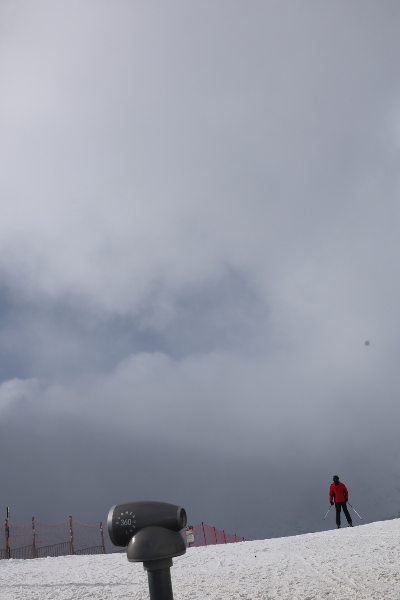 노출 측면에서는 흐린 하늘 조건에서 균형 잡힌 노출을 유지하여 눈의 세부 질감과 하늘의 흐림 사이의 균형을 잘 잡았습니다. 이는 높은 키(high-key) 이미지에 가깝지만, 망원경과 스키어가 어두운 요소로 작용하여 완전한 높은 키 이미지는 아닙니다.