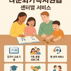 한국어 교육 - 기초부터 고급까지 단계별 한국어 수업- TOPIK 시험 대비반 운영 결혼이민자, 중도입국자녀 무료 제공, 교재 제공 통·번역 서비스 - 공공기관 방문 시 통역 지원- 서류 작성 시 번역 지원 결혼이민자 및 외국인 주민 전화 및 방문 통역 가능 자녀 교육 지원 - 학습지도 프로그램- 이중언어 교육 지원- 부모교육 및 자녀 상담 다문화가족 자녀, 학부모 방과 후 수업 및 멘토링 프로그램 포함 상담 서비스 - 가족 상담, 개인 상담, 부부 상담- 심리 상담 및 정신건강 서비스 모든 다문화가족 전문 상담사 배치 사회적응 프로그램 - 한국문화 체험 활동- 법률, 생활, 금융 정보 교육 결혼이민자, 중도입국자녀 계절별 행사 및 현장체험학습 포함 취업 및 직업교육 - 직업훈련, 이력서 작성법 교육- 취업 연계 및 창업 지원 결혼이민자, 외국인 노동자 고용노동부, 여성새로일하기센터와 연계 가족 통합 프로그램 - 가족 캠프, 부부교육, 가족 간 의사소통 훈련- 갈등 해소 프로그램 다문화가족 전체 지역사회와 연계한 가족 행사 운영 이중언어 환경조성 - 부모-자녀 간 이중언어 활용 교육- 이중언어 코치 파견 다문화가정의 부모와 자녀 조기 언어교육 및 정체성 형성 지원 모국방문 지원 - 친정 방문 프로그램- 모국어 교육, 정체성 찾기 프로그램 결혼이민자 및 자녀 일부 센터에서 예산 범위 내 운영 지역 특화 프로그램 - 전통문화 전파 활동- 외국인 커뮤니티 네트워크 형성- 요리, 공예 등 문화 교류 프로그램 지역 거주 다문화가족 및 주민 센터별 상이, 사전 신청 필수 추가 정보