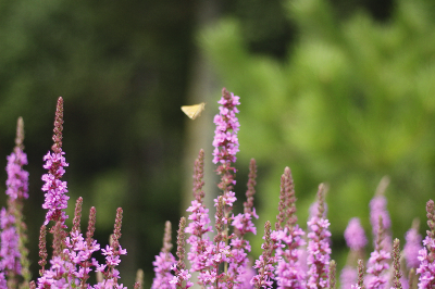 - 주제: 사진에는 연보라색~자주색 계열의 꽃들이 피어 있는 장면이 담겨 있습니다. 꽃 위쪽으로는 작은 노란색 나비(또는 나방)가 날아다니고 있어 자연스러운 생동감을 줍니다.