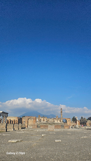 - 기둥 사이의 공간이 사진 속에서 또 다른 프레임 역할을 하며, 배경의 베수비오 화산과 유적을 자연스럽게 강조합니다.